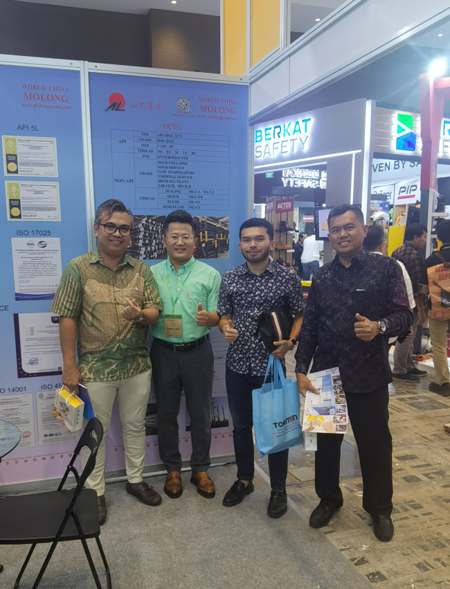 At the exhibition, the responsible comrade in charge of Shandong Molong actively attended the relevant leaders of Indonesia National Petroleum Company, and provided a detailed introduction to the company's main products such as oil pipes, oil casings, oil pumps, and oil rods. They also systematically elaborated on the company's industrial layout and market expansion. During this period, we had in-depth exchanges with petroleum equipment companies and manufacturers in the same industry regarding the market and drilling technology, and gained a detailed understanding of professional knowledge in oil and gas exploration, production, transportation, storage, and other aspects. At the same time, through self promotion, more customers have gained a better understanding of the company's production status and product content, thereby enhancing the company's international reputation.